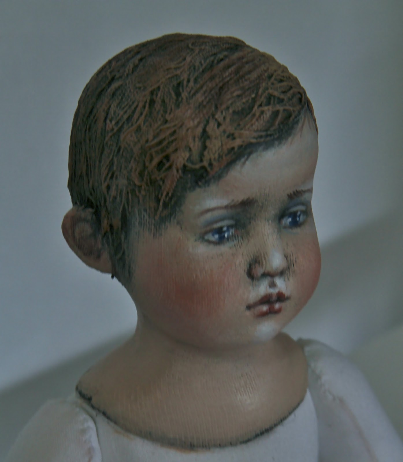 I was painting this little boy's face when news of the Paris terrorist attacks was filtering through.......I have called him "Etienne" - it seemed apposite, and also, I think he has a kind of European look to him. He is a 12' (30 cm) jointed cloth doll with a cloth over clay head painted with artist's acrylics. His hair was formed using cotton thread impregnated with glue and applied to his head. He sports some nice warm hand-knitted winter woollies, wool fabric shorts in brown with a fine lighter stripe and I made his socks with some new 2-ply merino yarn that I sourced from